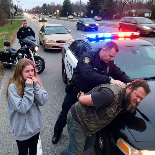 When I arrived, the scene made no sense. Emma’s car was pulled over. Two cruisers were nearby. And the biker—the man I had imagined as a threat—was standing casually with the officers, talking like they’d known each other for years.