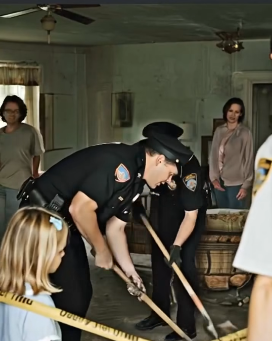 The officers began prying up the boards at the spot the girl had indicated. Silence enveloped the room, broken only by the creaking of the tools and the occasional shuffling of boots. Then—a scream shattered the quiet. One officer dropped his crowbar in shock, and the other froze, staring at what was revealed.