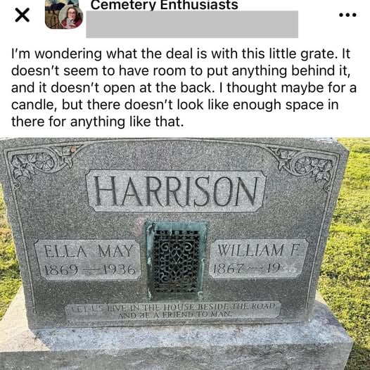 Not the name, not the dates carved carefully into the stone—but the grate itself. It draws your eye immediately, as if it doesn’t quite belong there and yet somehow belongs more than anything else. It looks like it was pulled straight from the floor of an old, long-forgotten parlor and set gently into the grave marker. A piece of something once lived in, once loved. Something warm.