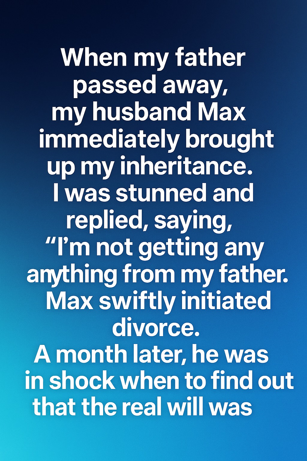 In those fragile days, when the world seemed softer and more tender than usual, Max, my husband, did something that stunned me. Just a few days after the funeral, as I sifted through condolence cards and half-eaten casseroles from neighbors, he asked about the inheritance. No preamble, no gentleness—just, “So, did he leave you anything?”