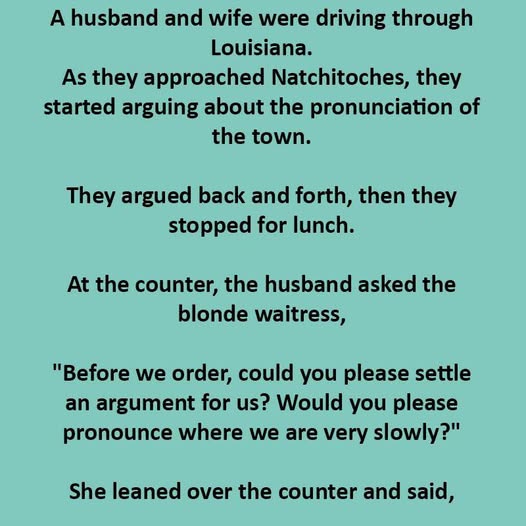 In an instant, the tension that had been building for forty miles disappeared. Suddenly, the “correct” pronunciation of Natchitoches was completely irrelevant. The absurdity of their egotistical conflict and the flawless, unintentional comedic timing of a young woman merely attempting to carry out her duties were what mattered. The waitress’s literal reading of David’s request had exposed their petty arguments and shown them how insignificant they actually were.