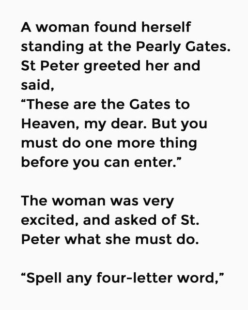 St. Peter leaned slightly forward, a twinkle in his eye. “Spell any four-letter word,” he instructed, his tone light but firm.