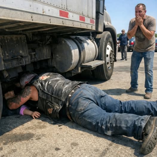 I collapsed onto the asphalt, my heart pounding like it was trying to break out of my chest. Lily was trapped beneath the front axle, one small shoe visible under the engine. I could hear her crying—soft, terrified, fading in and out as panic swallowed the street. I tried to crawl toward her, but the space was impossible, and the heat from the engine forced me back. People were shouting. Someone was calling emergency services. The driver kept repeating apologies that meant nothing. And then I heard it—the deep rumble of a motorcycle.