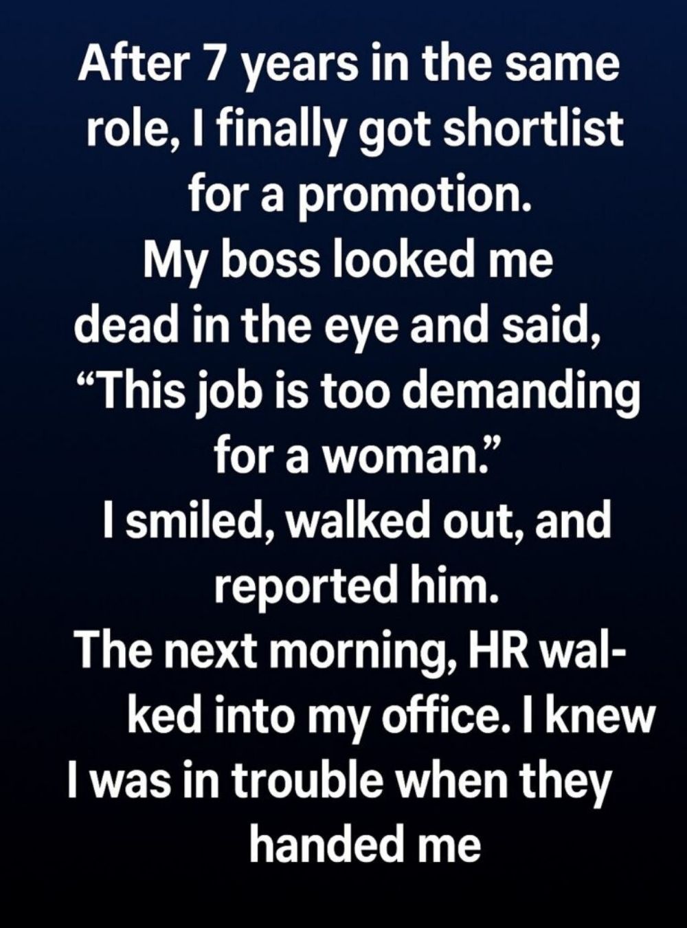 After seven years of unwavering loyalty, endless late nights, and countless sacrifices, she finally got the promotion meeting she had dreamed of. Every email she sent, every project she led, every moment she had stayed late to cover a colleague’s mistake had been building toward this. She had rehearsed her pitch countless times in front of her bathroom mirror, envisioned the nods of approval, the warm congratulations, the feeling of validation that would wash over her after years of patient persistence.