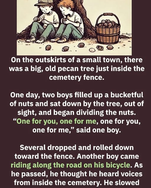 On the very edge of a sleepy little town, where the pavement narrowed and streetlights became few and far between, there was an old cemetery enclosed by a rusted iron fence. Inside that fence stood a huge pecan tree, ancient and generous, its branches spreading wide as though it had been there long before anyone ever thought to mark graves beneath it.