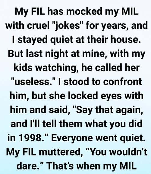 For as long as I’ve known my in-laws, my father-in-law has had a sharp tongue, cleverly disguised as humor. Every single family dinner followed a pattern so familiar that it had become almost predictable — he’d make a snide, cutting comment about my mother-in-law, everyone else would laugh awkwardly, forcing smiles that didn’t reach their eyes, and my mother-in-law would return a tight, practiced smile, brushing it off with a gentle, “Oh, that’s just how he is.” Over the years, I had watched this dance repeat itself countless times, each repetition chipping away at my comfort and leaving a sour taste in my mouth.
