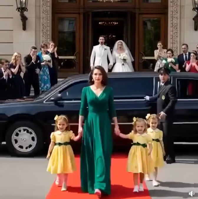 Out came three little girls — identical triplets, dressed in pale yellow, curls bouncing, eyes wide with wonder. Their small hands were clasped together as they looked around at the grandeur of it all. And then, behind them, stepped Emily.