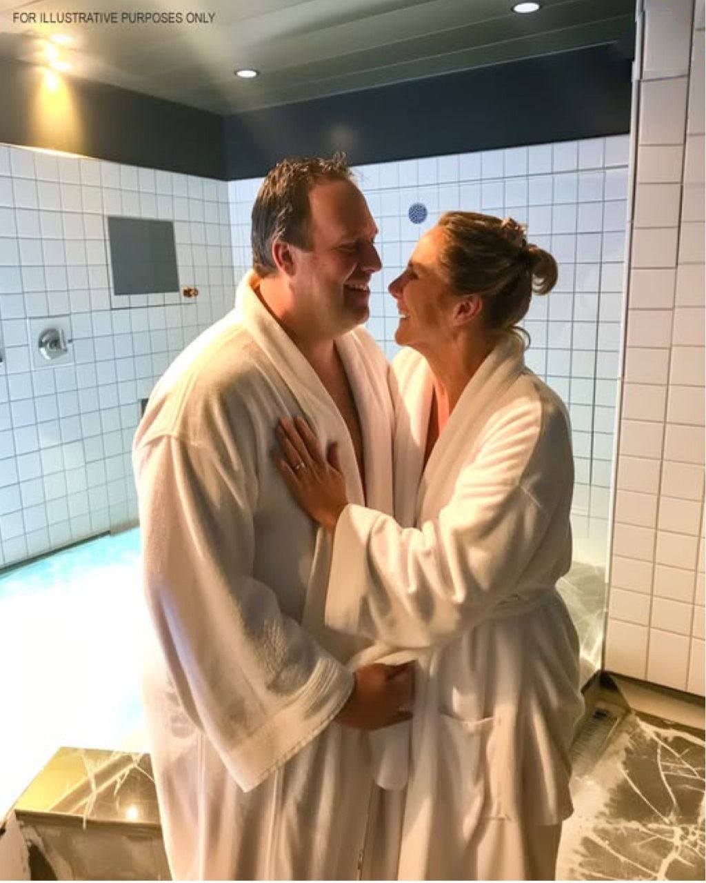 Inside, the scent of eucalyptus and luxury filled the air. And then I saw them: Damien and Maribel, side by side in plush white robes. They laughed, leaned close, and — to my horror — kissed.