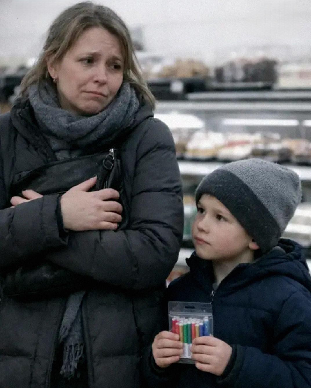 A woman stood at the counter, gripping her purse tightly, her knuckles pale. Next to her was a little boy, maybe six years old, holding a pack of birthday candles and buzzing with excitement only a child can feel.