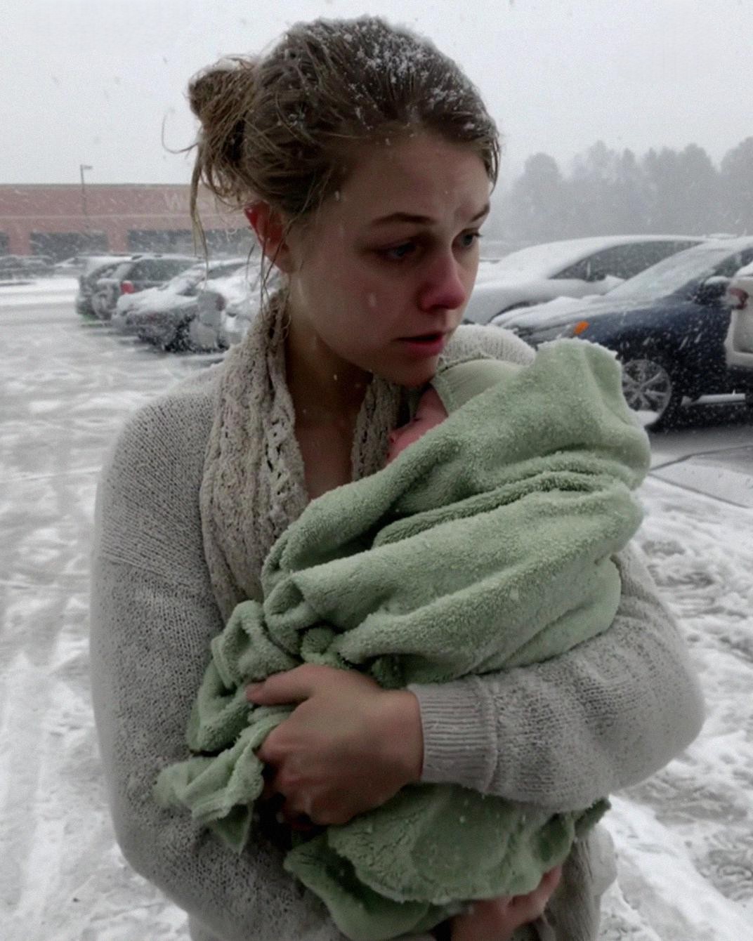A young woman stood by a lamp post, clutching a baby as though someone might snatch him away. She wore no coat, carried no bags, just a thin sweater and a towel wrapped around the infant. Her knees shook from the cold. The baby’s tiny fingers peeked from the edge of the towel. Both looked like they’d been standing there far too long.