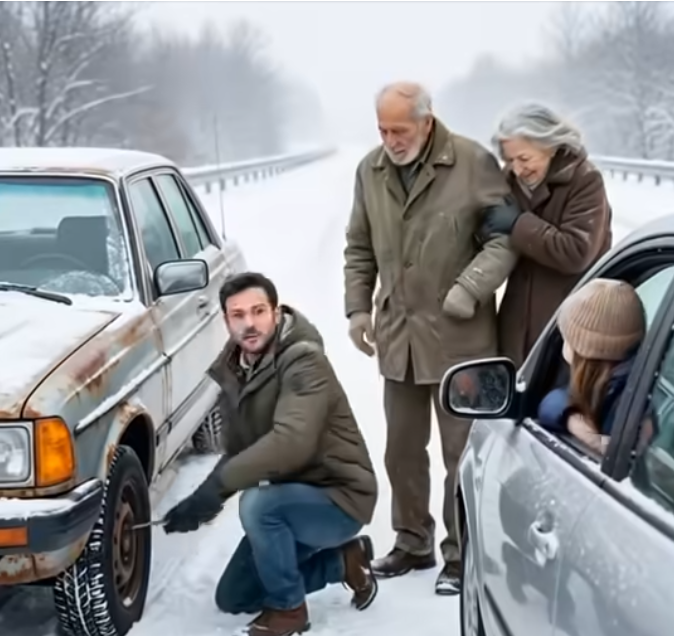 We were about forty minutes from their house when I saw the old sedan on the shoulder of the highway. The rust on the wheel wells and the sagging bumper told the story of years gone by. One tire had shredded so badly it looked like it was trying to escape. An elderly couple stood beside it, battling the cold in their threadbare jackets. The man was struggling with the lug nuts, his gloved hands trembling, while the woman huddled against the wind, wrapping her arms tightly around herself.