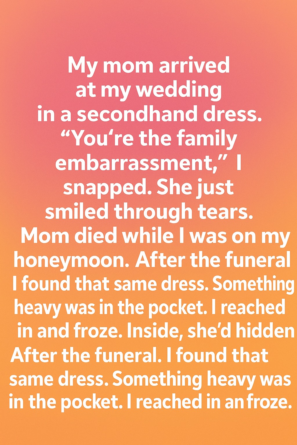 I used to imagine my wedding day as the kind of memory that would live in my mind like a warm photograph—soft edges, glowing colors, a place to return when I needed comfort. But the moment that stayed with me wasn’t tender or cinematic. It was the instant my mother walked into the venue wearing a secondhand dress, and I felt a sharp, shameful sting of embarrassment that still lingers in my bones.