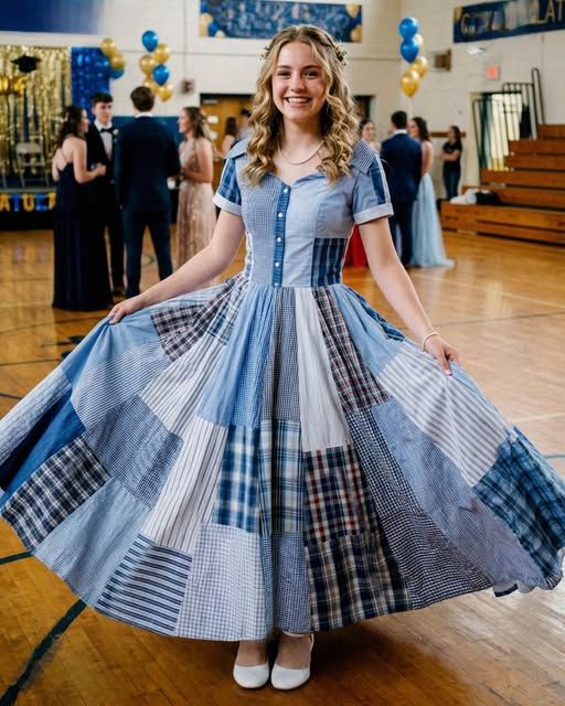 Prom season came anyway, full of expensive dresses, rented cars, and conversations I no longer felt part of. Until I opened that box. Blue shirts, gray ones, even the faded green one he wore the day he taught me to ride a bike—all of them carried pieces of my life with him. With the help of my aunt Hilda, I decided to turn them into something I could carry forward. We carefully deconstructed his clothes and stitched them into a dress. It wasn’t just fabric—it was memory, routine, comfort, and love, all sewn together.
