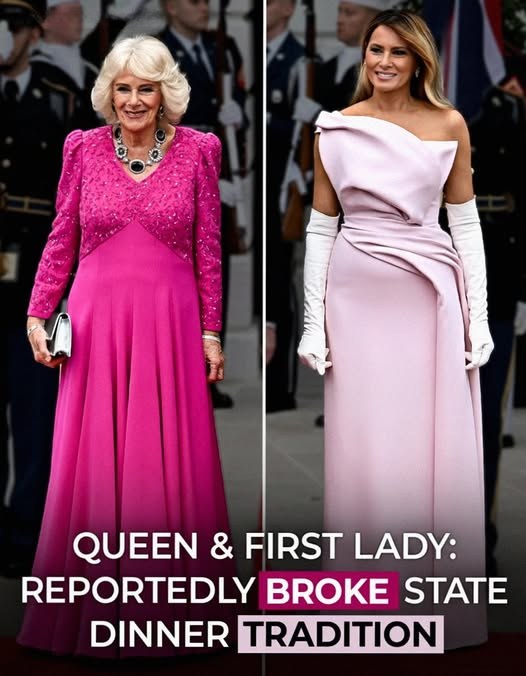 Queen Camilla, on the other hand, opted for a much brighter shade of pink, layered historical jewelry, and a more conventional evening silhouette. Camilla’s ensemble tended toward continuity, but Melania’s leaned toward contemporary minimalism. However, despite these distinctions, both options ended up in the same hue family, which is precisely why people took note. Whether or not they were coordinated, two tones of pink read as deliberate in an environment where white has long reigned.