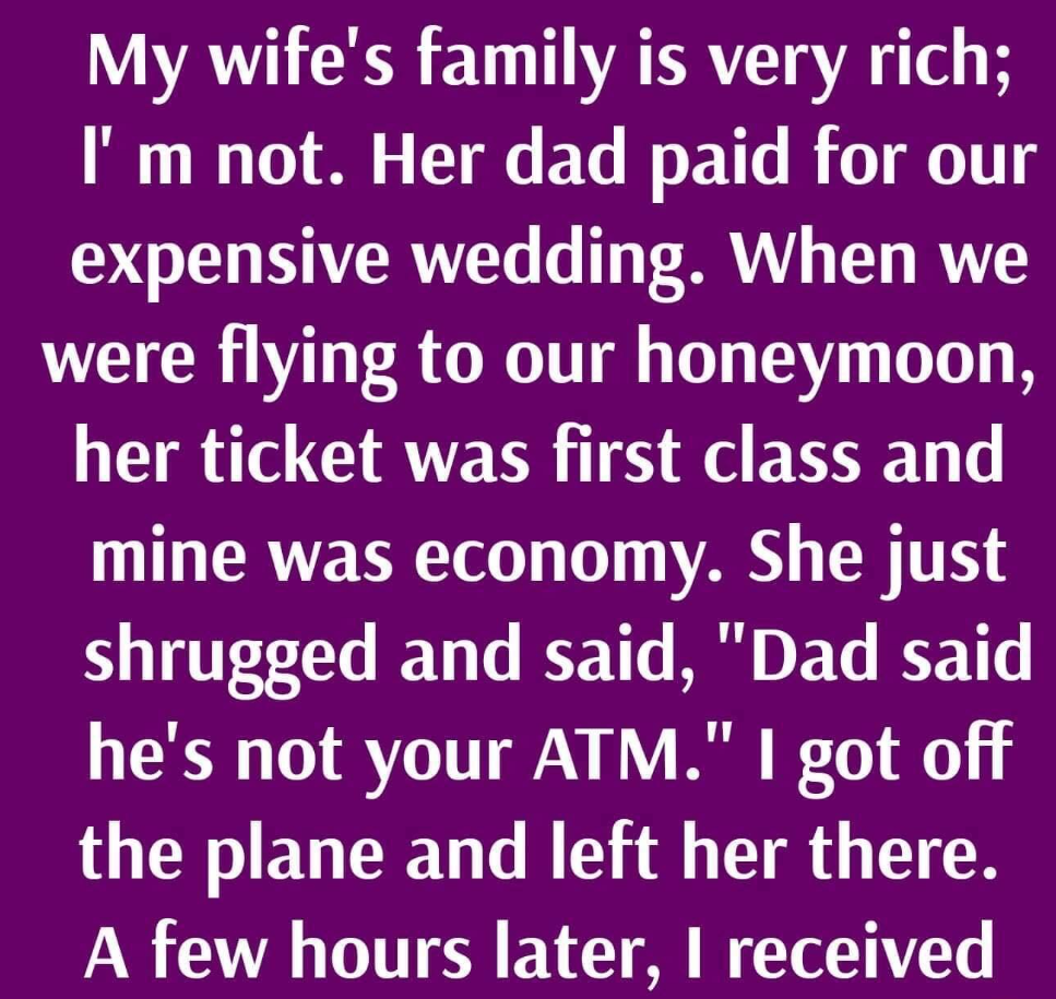 Things started to unravel the moment the honeymoon began—or rather, didn’t. “When we got to the airport,” Darren said, “my wife’s ticket was for first class. Mine was economy. I thought it was a mistake at first, but when I asked her about it, she just sighed and said, ‘Yeah, Dad booked it that way. He told me he’s not your money machine.’ Then she tried to laugh it off like it wasn’t a big deal. But to me, it was humiliating. I was her husband, not some tagalong. Sitting in the back of the plane while my new wife relaxed in first class felt like a slap in the face.”