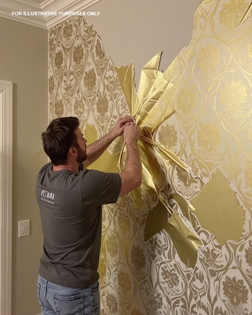 I ran into the living room. There he was, standing on a chair, ripping the wallpaper from the walls in jagged strips, leaving behind raw, uneven plaster.