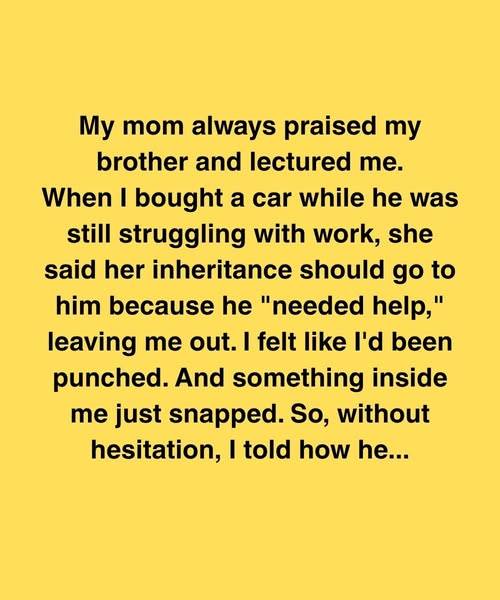 When I bought a car while he was still struggling with work, she insisted that her inheritance should go to him because he “needed help,” leaving me out entirely. I felt like I’d been punched in the chest. Something inside me just snapped. Without hesitation, I confronted the truth—I told her how he had stolen from me—twice—and lied directly to my face about it.