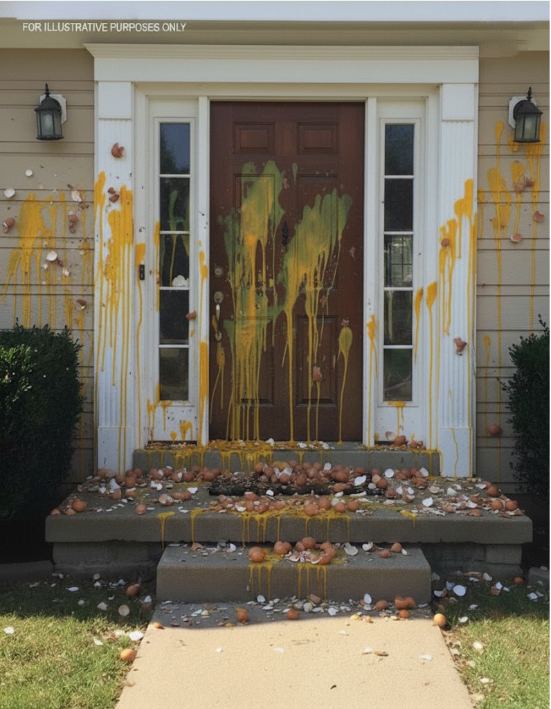 My front door was covered in eggs. Thick yellow streaks ran down the white paint, and shells stuck to the wood, crunching under my slippers. Trash was scattered everywhere—crumpled paper, an empty soda can, even a banana peel.