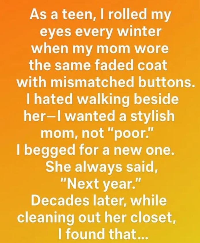 When I was a teenager, I used to cringe every winter when my mom brought out her old, faded coat. It was a dull brown thing with mismatched buttons, frayed edges, and a worn collar that had seen far better days. I hated walking next to her in it. I wanted her to look stylish, not like someone who couldn’t afford better. I remember begging her every year, “Mom, please, just buy a new one.” She’d smile softly and say, “Next year, honey. Maybe next year.” I thought she was just being stubborn, maybe even careless. I never understood.