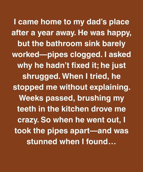 I couldn’t help but feel a mixture of emotions as I sat there in the bathroom, surrounded by these tiny memories. I had been frustrated with him, annoyed by the simple plumbing problem that seemed to hang over us. I had thought it was just another one of those things he couldn’t be bothered to fix. But now, it was clear to me. This wasn’t a plumbing problem at all. It was something much deeper, something I had never imagined. The clogged pipes weren’t a nuisance— they were a treasure chest. A collection of keepsakes, memories wrapped up and hidden away like precious jewels. My dad hadn’t neglected the sink because he didn’t care. He had avoided fixing it because the sink wasn’t just broken—it was a secret he didn’t know how to share.