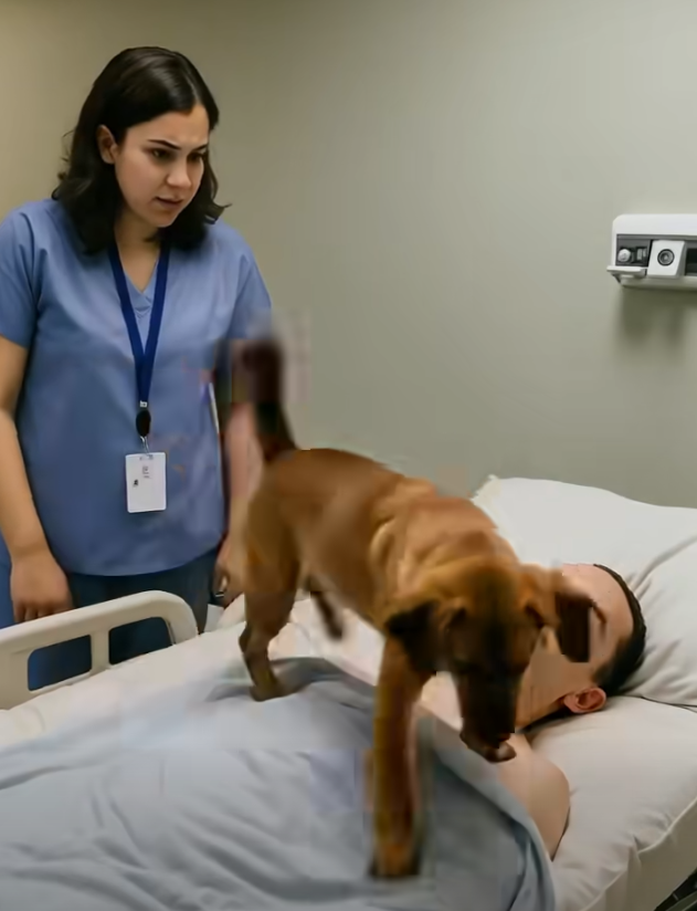 That morning, as nurses adjusted monitors and doctors moved silently around the room, someone brought Lari in. The dog entered slowly, paws clicking against the cold tile, ears lowered in instinctive caution. His head tilted slightly as he scanned the room, his gaze flicking between the doctors, the humming machines, and the still figure on the bed. For a long moment, he hesitated, unsure what to do in this strange and sorrowful environment. Then, sensing his partner, his friend, his human, he moved purposefully forward.