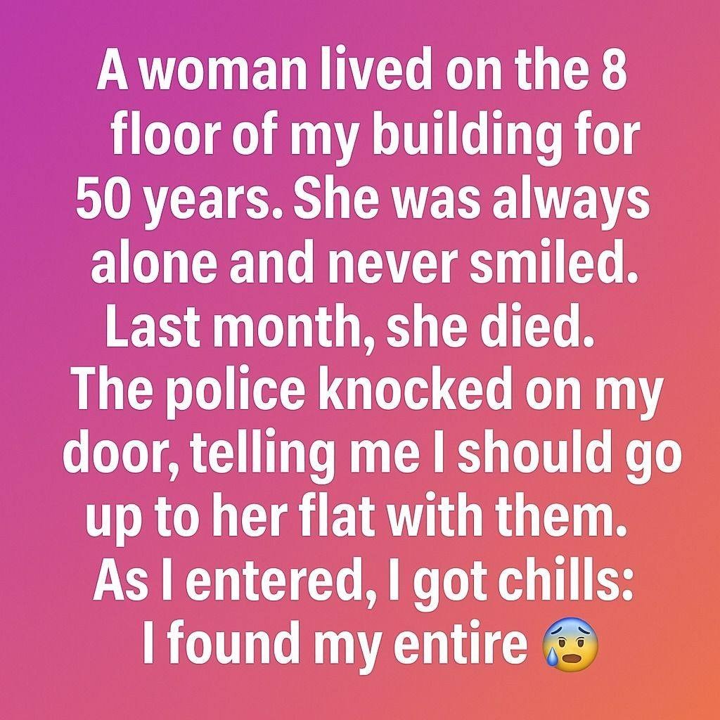 For fifty years, the woman on the eighth floor lived alone. No visitors. No laughter. No warmth behind her window—just a soft yellow glow that flickered on every evening and went dark before dawn. Most people in the building barely noticed her anymore. To them, she was just the quiet old lady upstairs.