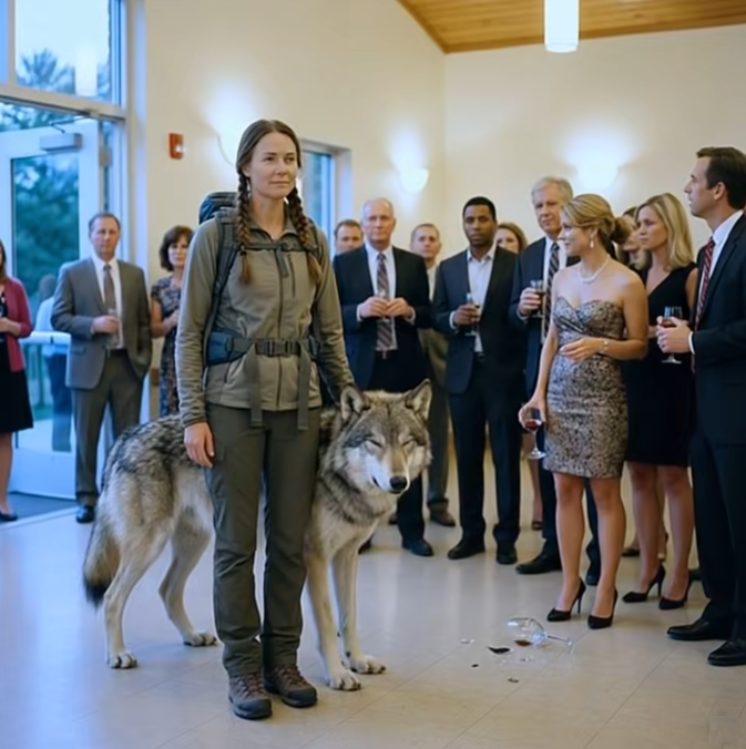 Silence spread instinctively as a gray-white wolf entered first—lean, powerful, its thick fur rippling with each step. Its amber eyes scanned the room with calm vigilance, a presence that demanded no permission. At his side walked a woman shaped by the desert rather than memory: scuffed boots, utility pants, dark hair braided tightly down her back, a leather satchel held close like a shield.