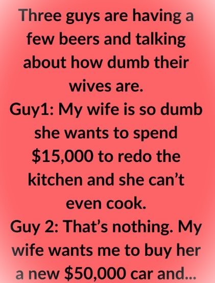 Three men were sitting in a small neighborhood bar, each with a beer in front of him, unwinding after a long and exhausting week of work. The dim lights reflected off the amber liquid in their glasses as they settled into the familiar comfort of the worn leather stools. As often happens in conversations like this, the topic slowly drifted from the grind of their jobs to life at home. And, almost inevitably, it landed on their wives. With laughter, teasing, and the usual bar-table bravado, they began competing over who had the “dumbest” wife.