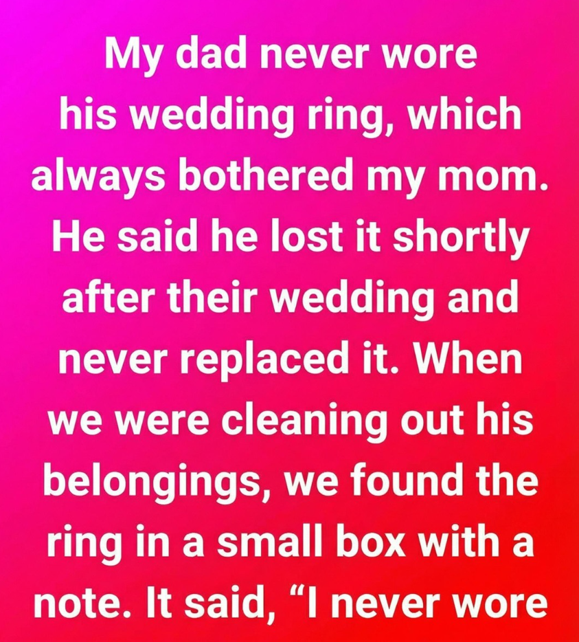 When we began sorting through my dad’s belongings after his passing, we expected the usual bittersweet ritual — dusty shelves, drawers full of forgotten tools, and stacks of odds and ends that hadn’t seen the light of day in years. What we didn’t expect was a small wooden box, tucked high on a closet shelf, carefully wrapped in a faded handkerchief as if someone had deliberately tried to protect it from the passage of time. Inside lay his wedding ring, still gleaming softly despite the decades, resting beside a folded handwritten note that immediately stopped us all in our tracks. At the top, he had written, “I never wore it because…” and in that instant, all of our long-held assumptions cracked wide open.