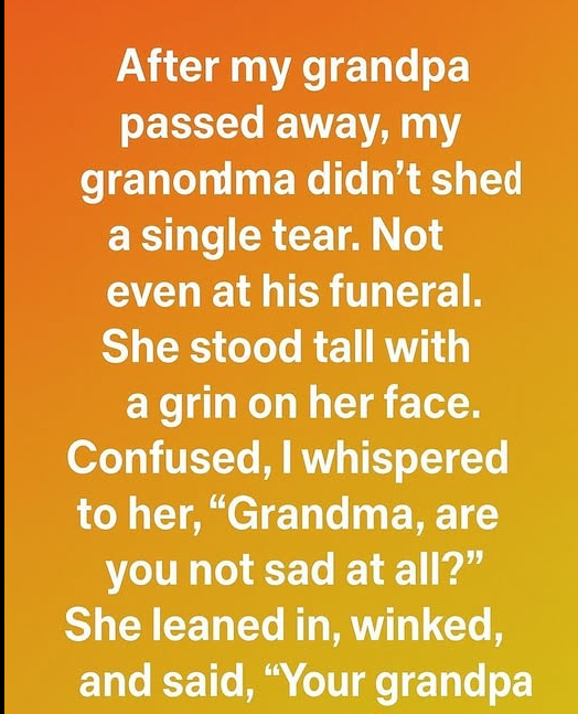 After my grandpa passed away, my grandma didn’t shed a single tear. Not even at his funeral. She stood tall, calm, and strangely peaceful, as if the weight of the world had passed over her without leaving a mark. People whispered quietly around her, unsure how someone could endure such loss without crumbling. Confused, I leaned closer one afternoon while helping her with some chores and whispered, “Grandma, are you… not sad at all?” She smiled softly, a smile that seemed to hold the secrets of decades, and said, “Your grandpa told me not to cry when he left — because he’d find a way to make me smile again.”